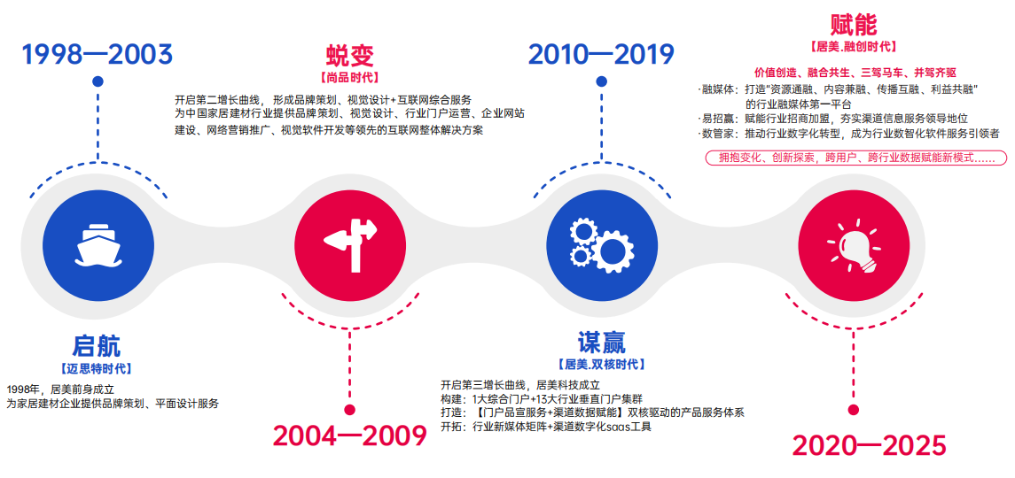 居美科技及前身始于1998年,自成立以來,秉承“賦能家居,價值互聯”的企業使命,致力于成為最受信賴的家居渠道服務企業,為中國家居建材行業持續賦能。累計已為超3200+家居建材企業提供了精準招商、品牌傳播、數字化工具解決方案。